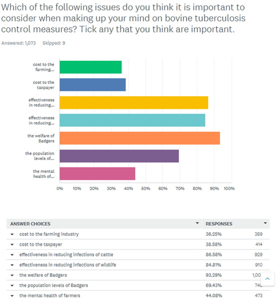 - By inspection of the free text responses it is clear that this is partly because half of our respondents did not feel that they identified the stated objective, but also because the stated objective in section 5.7 has an element of ‘reducing bovine tuberculosis’ (which most people support) mixed up with increased Badger culling as the mechanism (which many people do not support). How is the public supposed to answer Defra’s question 5 if they want to reduce bovine tuberculosis but do not want badgers to be killed by free shooting OR do not want badgers to be killed OR do not think that badger killing is effective OR want to know the costs OR have a wide variety of other concerns.