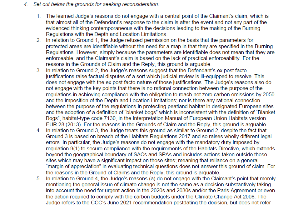 We told you last week that we had been refused permission for judicial review of the DEFRA regulations on burning on peatlands. Today we can tell you that we have appealed this judgment – it’s actually called a renewal. It’s quite a short document, see below, and basically says that the judge got it wrong and can another judge have another think about it please.
