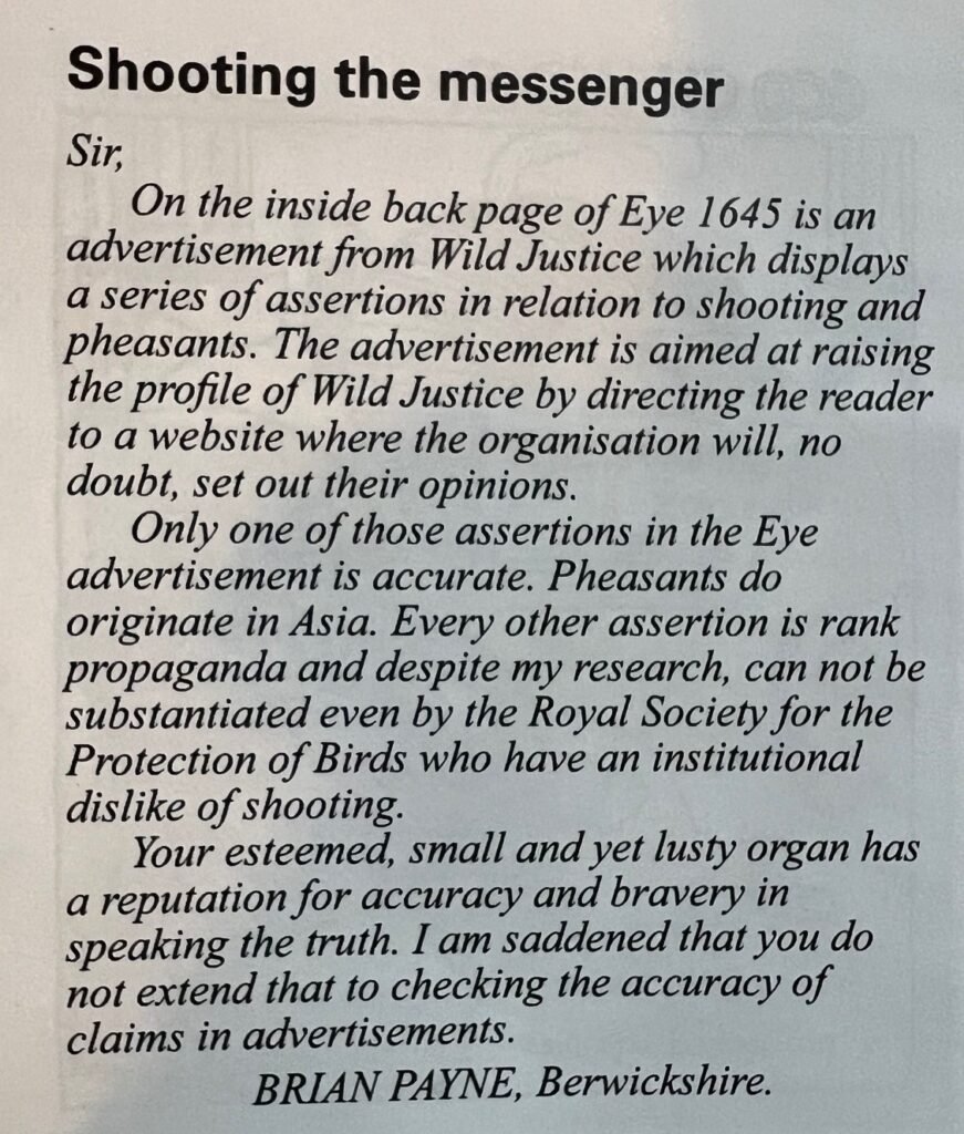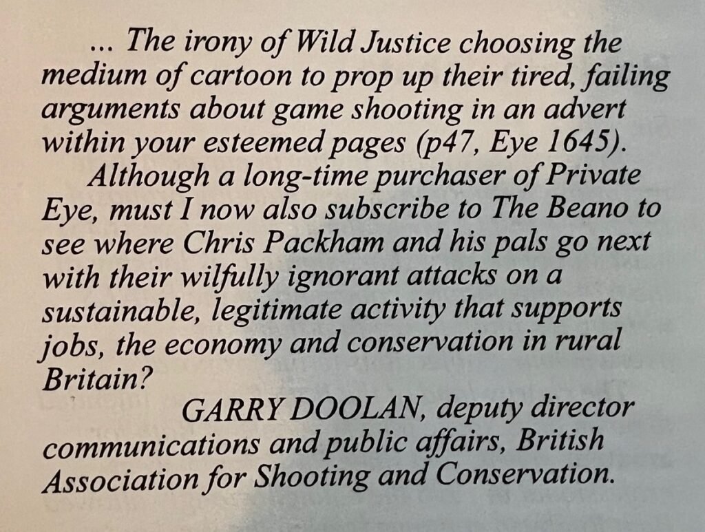 We cannot comment on the size or lustiness of Mr Payne’s organ or anything else but he shows no sign of having checked his facts, and Private Eye knew no better than to let him get away with it. At least we assume that Private Eye published these misguided remarks in good faith – what other explanation is there? But Private Eye was clearly happy enough to take Wild Justice’s money without checking, and then happy to print these letters without checking. Hmmm. Private Eye was right to rely on Wild Justice to know what it was talking about and wrong to think that BASC and others had any real answer. We’re grateful for every opportunity to put the record straight on gamebird shooting.