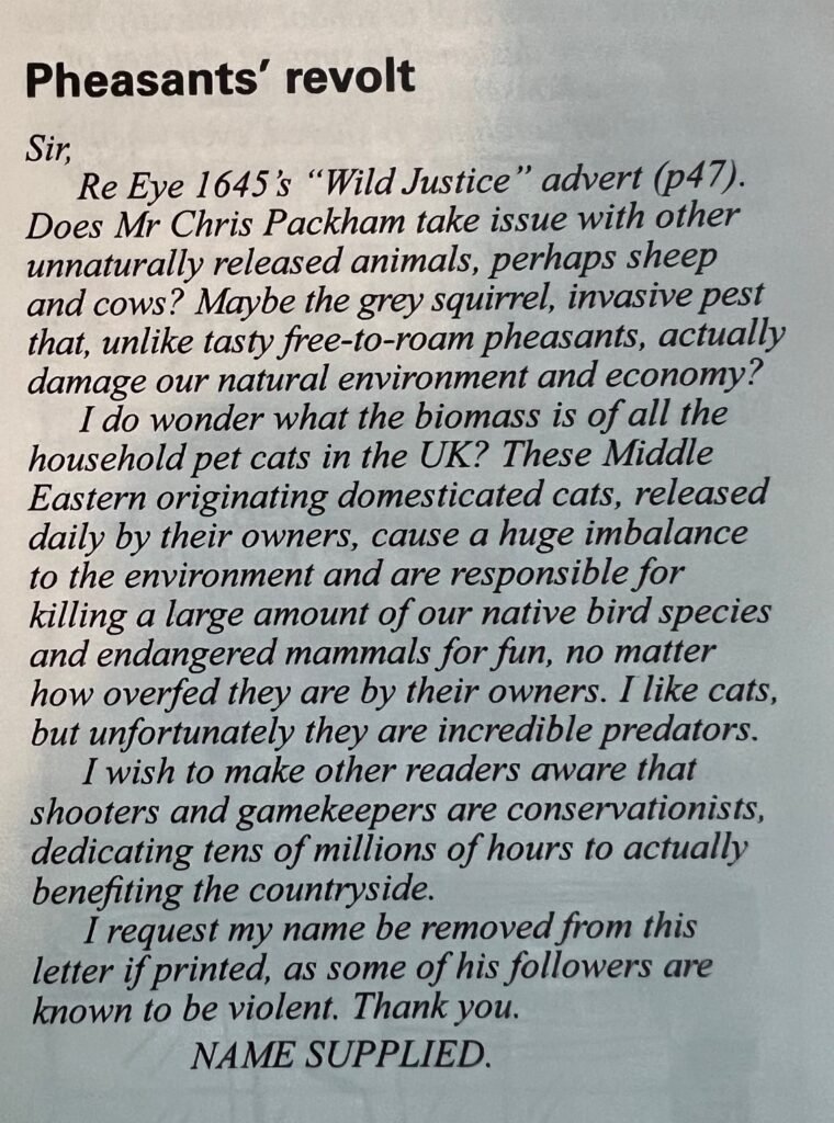 The third letter was from a Mr Payne who claims to have done some research on the matter of Pheasant releases: