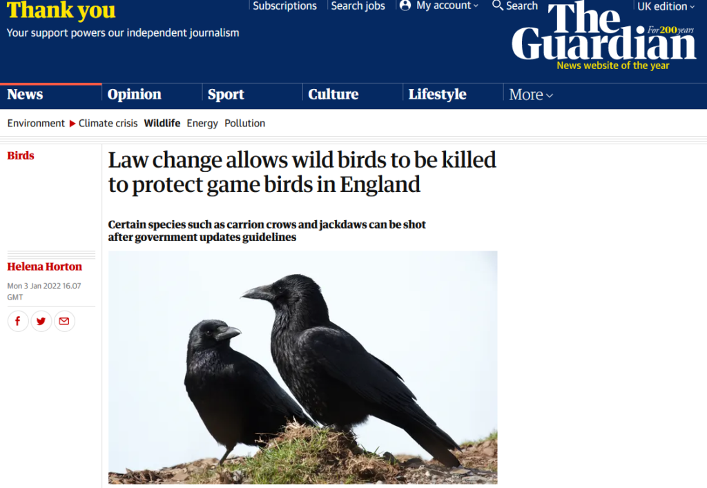 The story relates to the new general licences for England, which are very largely unchanged from last year’s licences. These are the licences, not just in England but across the UK, that Wild Justice has caused to be reformed since our original legal challenge back in spring 2019.