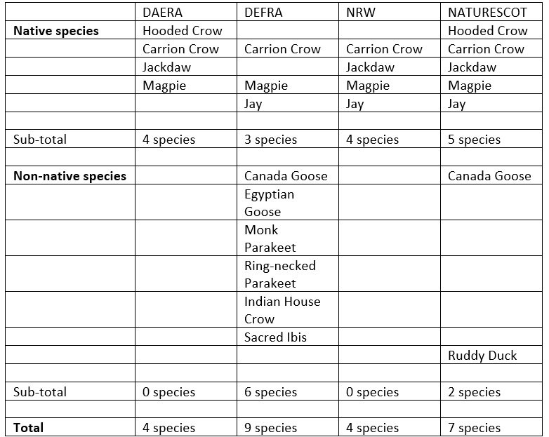 Here are three tables which set out the current position for the three different categories of general licence in each of the four UK nations.