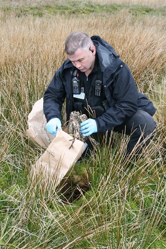 The man caught on camera was employed as a gamekeeper on the estate. In a dramatic moment captured on video, as he walked off the moor to reach his parked vehicle the gamekeeper encountered one of the RSPB’s team hidden behind a nearby wall. After being confronted about the shooting of the two owls, the gamekeeper turned on his heels and , took off running across the moor, being pursued by an RSPB investigator. Luckily, the police responded quickly to the RSPB’s call and arrived a short while later to handcuff and arrest the gamekeeper before he could leave the moor