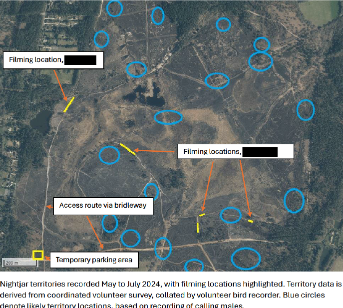 NE has disclosed to us that these (see below) are the Nightjar breeding territories but any birdwatcher would know that Nightjars do not hop about on the ground in a small area to feed – they will be swooping around all over this heathland.