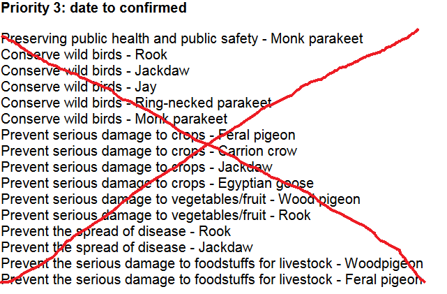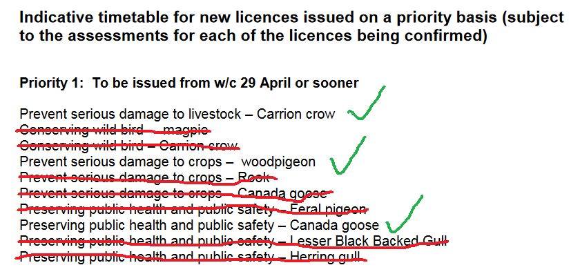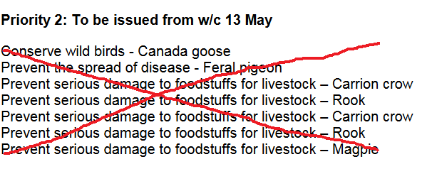 The cells in the table coloured green (Priority 1), yellow (Priority 2) and brown (Priority 3) were Natural England’s plans for issuing new licences in pretty quick time. Then Defra waded in and took over the process of issuing new licences with five working days consultation period starting on the Bank Holiday weekend at the beginning of May (Saturday 4 May). That consultation ended on 13 May and Defra said that Michael Gove would take a further week to review all the information and come to a decision – that would take us to the 20 May.