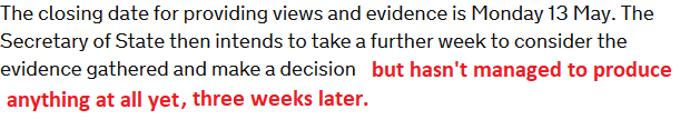 None of this can be blamed on Natural England – the responsibility for this was wrested from them by Defra in early May. And Defra promised that Michael Gove would make his decisions by 20 May. That is now two weeks overdue: