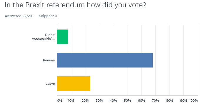The UK was split very close to 50:50 on Brexit – Wild Justice newsletter subscribers who voted and disclosed how they voted were almost 75:25 Remain.