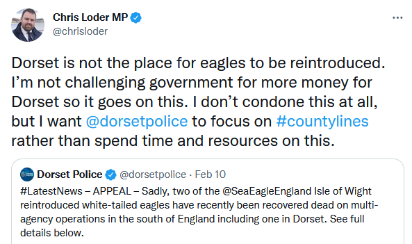 Last week, following the news that two White-tailed Eagles from the Isle of Wight reintroduction project had been found dead, and an appeal from Dorset Police for information, Chris Loder MP took to Twitter to declare that ‘Dorset is not the place for eagles to be reintroduced’. He also stated that he’d prefer Dorset Police to focus on issues other than potential wildlife crime. Following widespread public criticism, Mr Loder doubled-down on his viewpoint, going on to accuse eagles of ‘killing our lambs and plaguing our farmers’.