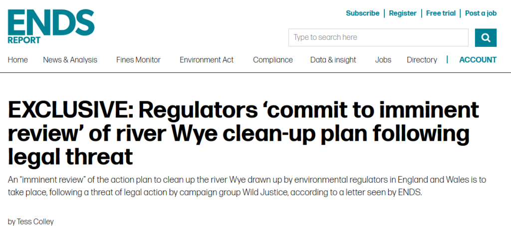 There have been a few local media reports about Wild Justice taking legal action on the shocking state of environmental protection on the River Wye but we haven’t said anything about this case until today when we talked to the respected ENDS report.