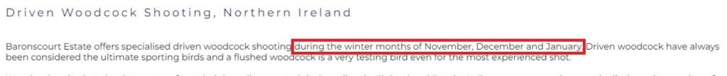 In what appears to be a response to our campaign, one such estate, the Baronscourt Estate, home to the Duke and Duchess of Abercorn, has removed evidence from its website that if offers Woodcock-shooting in November.
